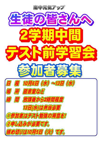 2学期中間テスト前学習会の案内
