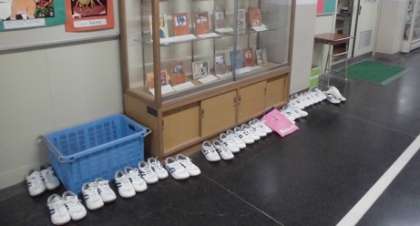 ろうかにくつがならびます。でもこれは、下ぐつではなく、体育館シューズ。移動教室の授業が2コマ連続していて、次の次の授業に必要な体育館シューズをもって移動している、の図なのでした。