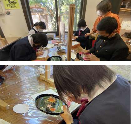 山中漆器のお盆に絵を描き、最後に金粉を散らして蒔絵を完成させました。 とても美しいです。