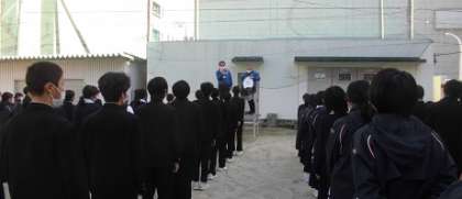 期末テスト最終日に、避難訓練をおこないました。みんな真剣に訓練にとりくみます。簡易トイレの使用方法もまなびました。