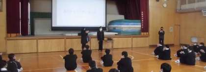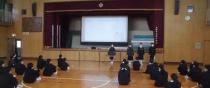 今週の学年集会は、生徒会執行役員のひとたちから、SNSなどスマホの上手な使い方についてお話がありました。