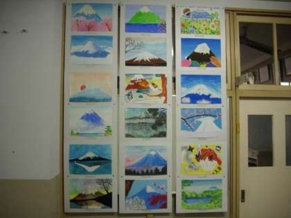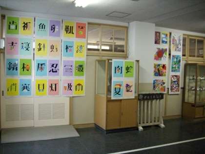 美術室前の廊下の壁面には、夏休みの課題などを展示しています。