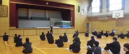 毎週木曜日の朝は、2年生の学年集会です。生徒どうしの距離をとっての開催です。
