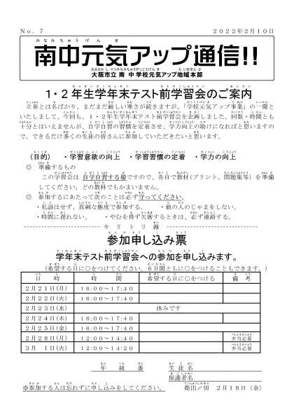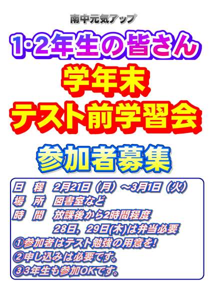 元気アップ学習会のおしらせです。1・2年生の学年末テスト前学習会をおこないます。くわしくは、案内をごらんください。3年生の皆さんの参加も歓迎します。