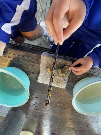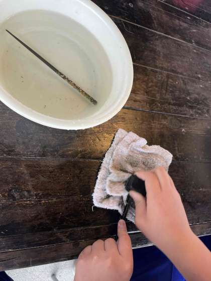磨いて 磨いてアワビ貝の模様が出てきたら完成間近です。