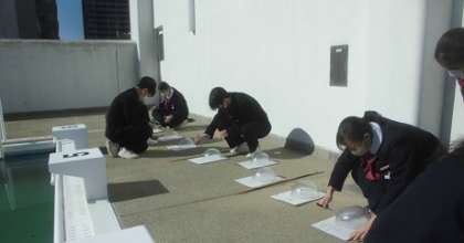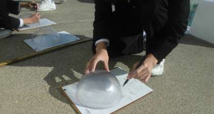 本日、3年生では透明半球をもちいて、太陽の日周運動の観測をおこないました。なかなかよいデータがとれそうですよ。天気もよくて絶好の観測日和となったのでした。
