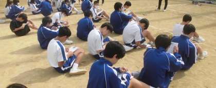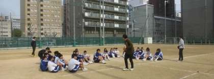 今日の体育の時間は、チームのとりくみです。先生の解説をよく聞き、よりよい動き方を自分たちで話し合って、つぎつぎとトライします。最後は、シートに記入して今日のとりくみをふりかえりました。