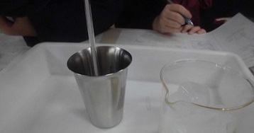 金属コップの表面がくもりはじめる、そのいっしゅんをみのがすまいと目をこらして観察しました。グラフをかき、レポートをしあげます。数値計算、グラフのよみかき。苦手な分野がつづきますが、みんなの熱意がおとろえることはありません。