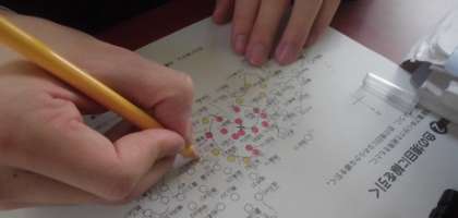 地震のゆれが、震央から同心円状にひろがっていくようすを、作図でたしかめました。色をぬりわけ、コンパスで等方性を確認します。とてもきれいに作図できましたよ。