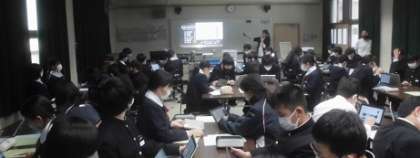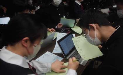 2年生の進路学習では、高等学校しらべをおこないました。ひとりPCを活用し、グループにわかれ、協力してしらべていきます。先生方が用意してくださった緻密なカリキュラムの甲斐あって、とてもよい進路学習となりました。