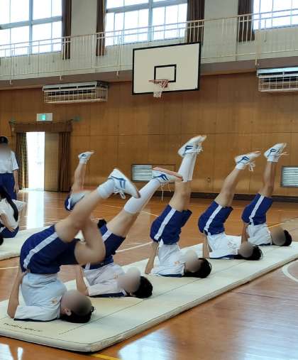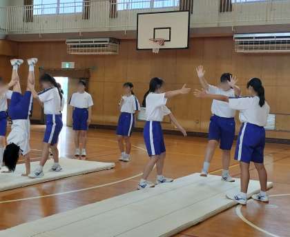 3年生の女子体育はマット運動をしています。難しい倒立もほとんどの子ができており、立った状態から後に反り両手をマットについて、立った状態に戻る練習も多くの子ができていました。