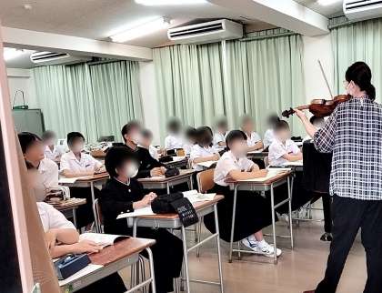 4時間目、1年1組は音楽です。先生がバイオリンを弾いてくれて子どもたちが拍手をおくっていました。
