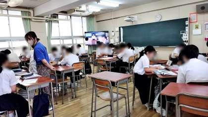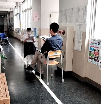 3年2組は英語です。教室でプレゼンの資料を作成しながら、廊下では一人ずつスピーキングのテストをしています。