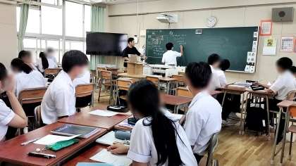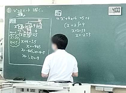 3年2組は数学です。生徒の代表が例題に習って問題を解いて、板書してくれています。