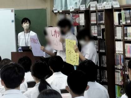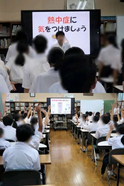 1年生は、熱中症のお話のあと、保健委員から夏休みの生活で気をつけてほしいことについて発表がありました。