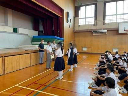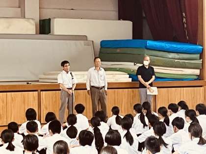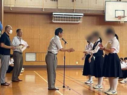 今日の生徒集会で、中央区長の稲嶺様、御津連合の会長様にお越しいただき、社明運動に関わるポスターに応募して選ばれた、3人の生徒に表彰状と記念品の授与をしていただきました。