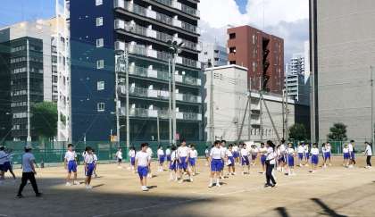 6時間目、3年生は学年演技の練習です。これまでの体育館から練習場所を運動場にうつして隊形移動の確認などをしています。