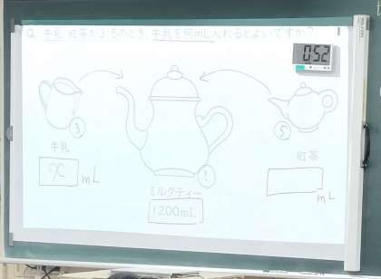 牛乳対紅茶が3対5の割合の1200mlのミルクティーを作るとき、牛乳を何ml入れるか?