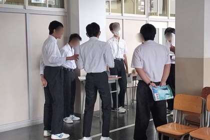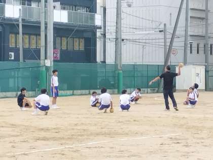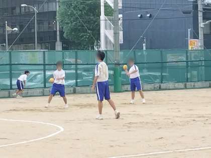 3時間目、2年生男子はハンドボールの授業です。投げ方を一から練習しています。