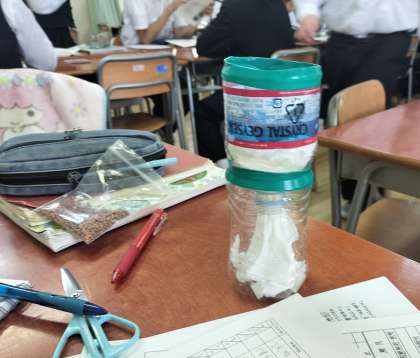 3年1組は技術科で、スプラウトを栽培する容器をペットボトルを利用して作っています。