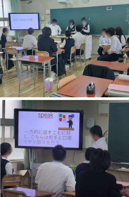 似たような意味の単語の使用法の違いを班ごとに調べて発表しています。