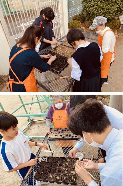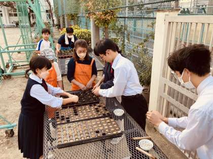 「種から育てる地域の花づくり活動」で、10月13日に子どもたちがまいた種からでた芽も大きくなってきたので、区役所の方と地域の皆さまにご協力いただき、大きなポットに移しかえる作業を放課後に行いました。