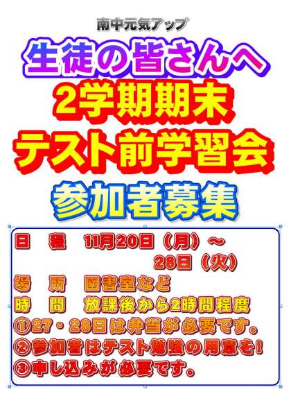2学期期末テスト学習会のお知らせ(南中元気アップ)