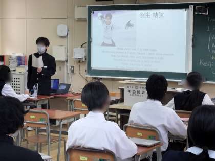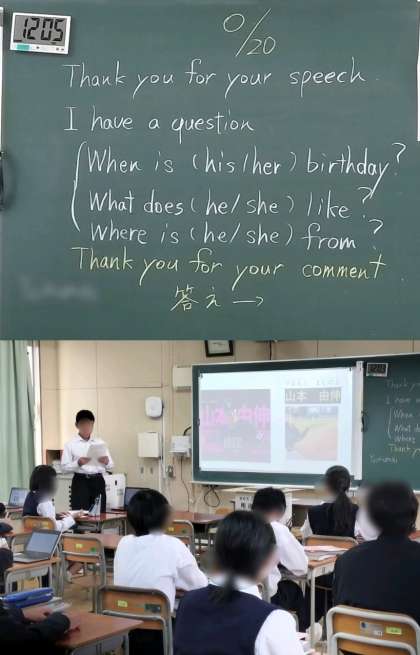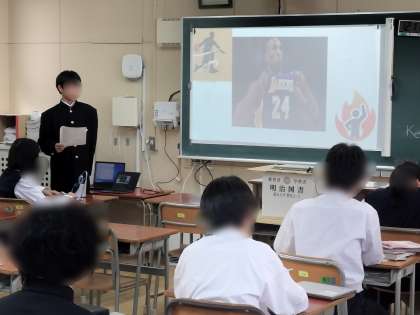 5時間目、1年2組は英語です。「my favorite person」についてプレゼンしています。