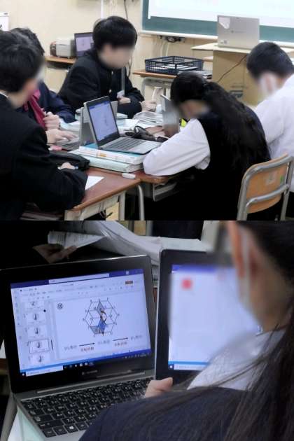1年1組は数学です。図形の対称移動についてパソコンで学習しています。