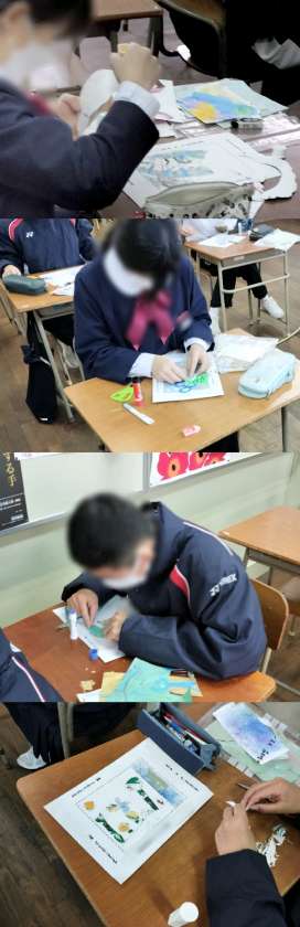 2時間目、1年1組は美術です。貼り絵を作っています。細かい作業を頑張っています。