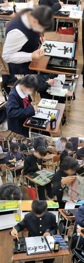 1年2組は国語です。習字の練習です。真剣に取り組んでいます。