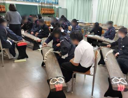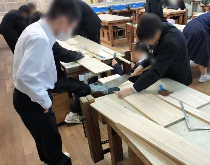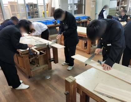 4時間目、1年2組は技術科です。木材をノコギリで切っています。