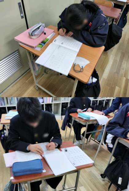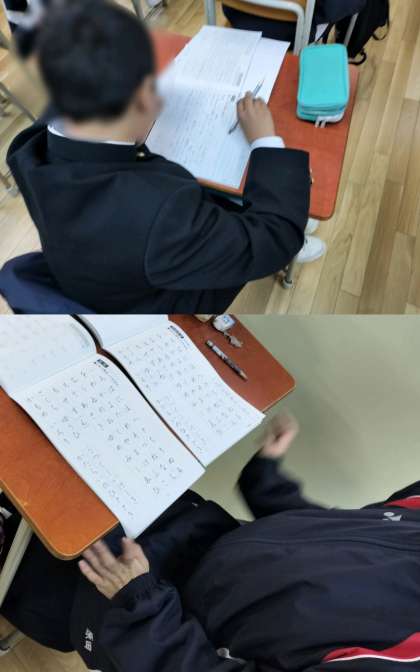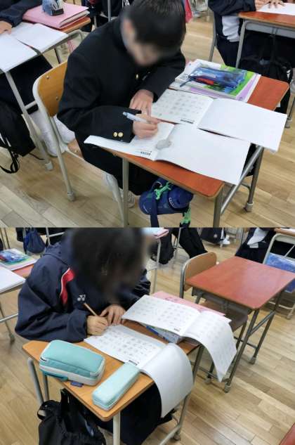 5時間目、2年2組は国語です。「行書」の練習です。お手本をみながら、真剣に練習しています。