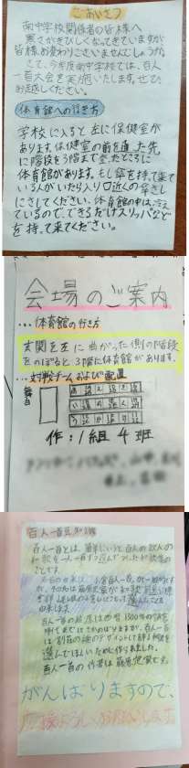 百人一首の豆知識やルール、会場図など、工夫して作成しています。