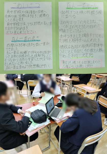 班で協力して、百人一首大会のリーフレットを作っています。