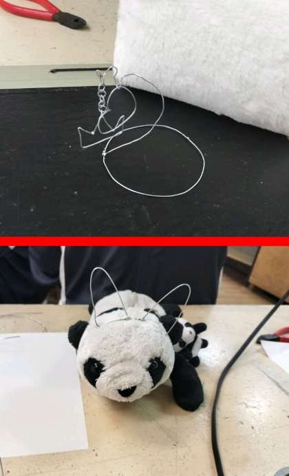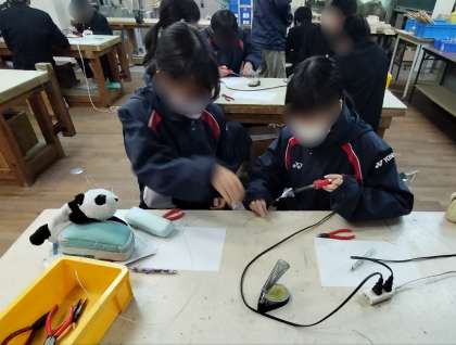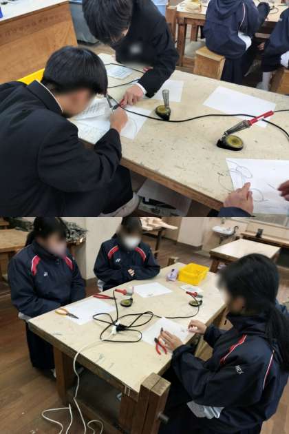 2年2組は技術科です。ハンダ付けの練習で、自分でデザインした作品作りです。