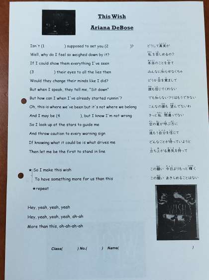 英語の歌の、歌詞が印刷されたプリントの虫食い部分を、実際、歌を聞きながら単語を聞きとり、記入していくのですが、早口の部分は聞き取るのが難しそうでした。