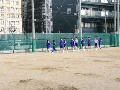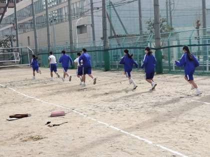 2時間目、1年生は体育です。今日はペース走です。各グループごとに一周のペースを決めて、先頭の子がペースキーパーになり走ります。