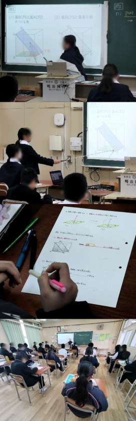 1時間目、1年2組は数学です。「平面と直線の位置関係」について学習しています。プロジェクターを使ってわかりやすく説明しています。