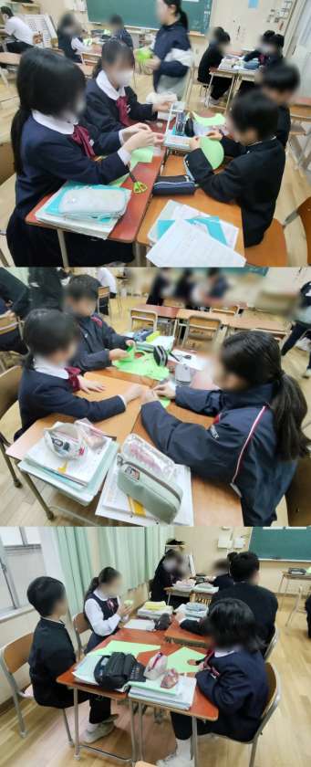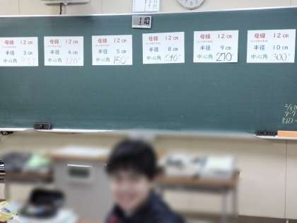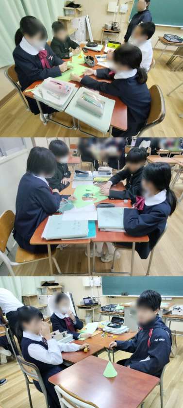 1時間目、1年1組は数学です。班ごとに母線、半径、中心角の違う三角錐を作っています。