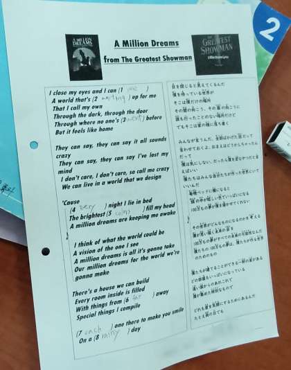 5時間目、2年2組は英語です。英語の歌の歌詞が印刷されたプリントの虫食い部分に、歌を聞きながら単語を聞きとり記入していきます。手を上げて正解を答えられた人はシールをもらっています。