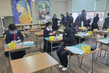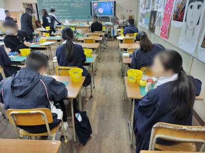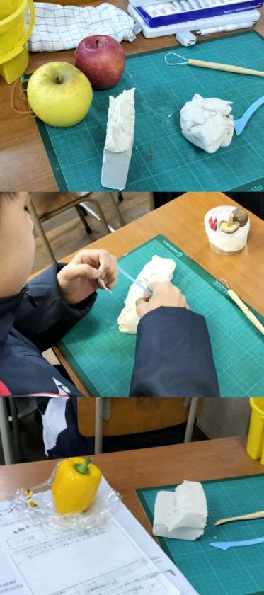 1時間目、1年1組は美術です。粘土で野菜や果物を作っています。
