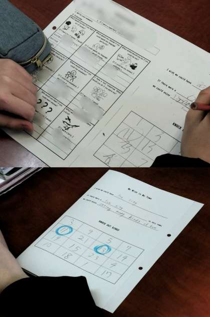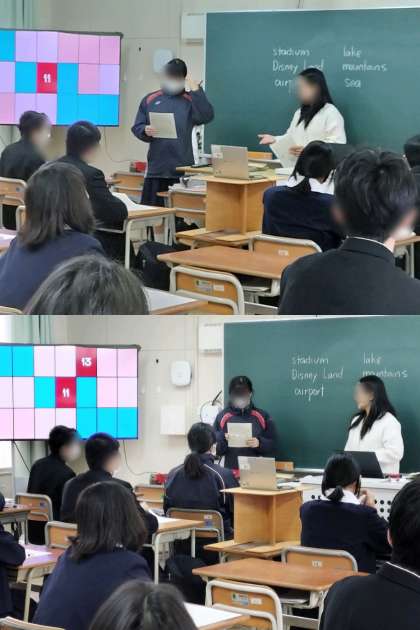 1時間目、3年1組は英語です。前で英文を読んだ生徒がパネルを選んで数字を出します。その数字でビンゴゲームをしています。