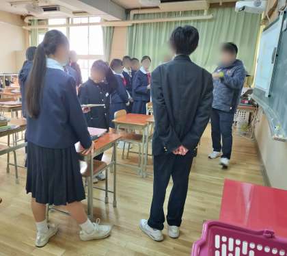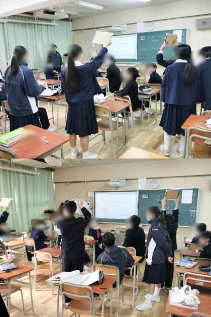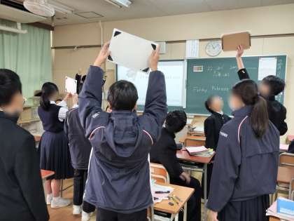3時間目、1年1組は英語です。過去形の単語を答えるクイズ形式の問題に、各グループから一人づつ答えて座っていきます。