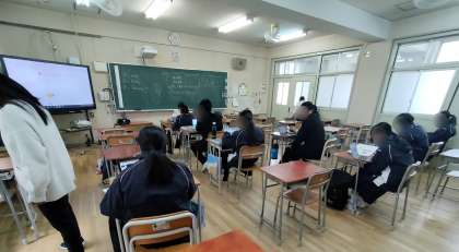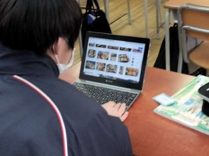 4時間目、2年2組は英語です。1組と同じ課題に取り組んでいます。「おせち」「カラオケ」「忍者」「浮世絵」「J-POP」など色々なお題に取り組んでいます。「鬼滅」は「忍者」か?などの議論もあります。