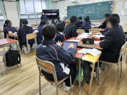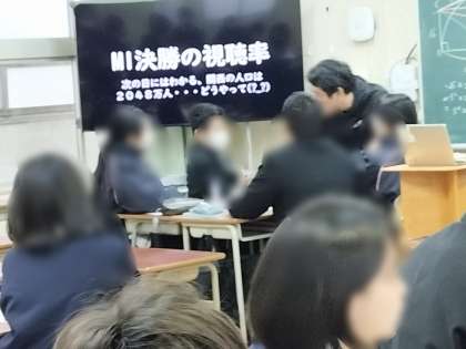 3時間目、3年1組は数学です。M1の漫才の映像を見ていたので、何をしているのか、と思って見ていると、M1の決勝のテレビの視聴率の話から、視聴率の割り出し方の話になり、「標本調査」について学習していました。