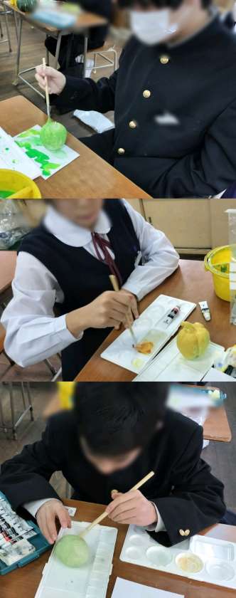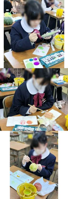 1時間目、1年1組は美術です。粘土で野菜や果物を作っています。