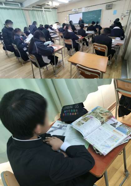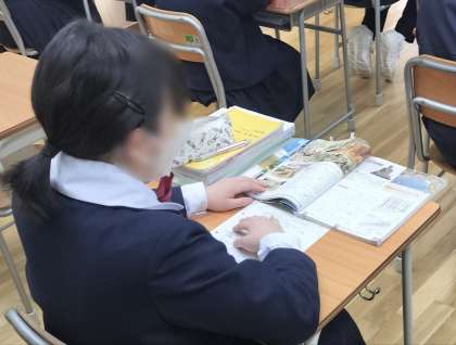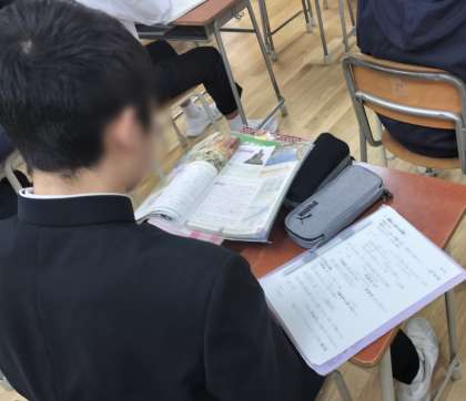 4時間目、1年1組は社会です。今日は歴史の授業です。平安時代の「院政から武士の政権へ」というところを学習しています。