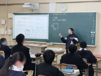 5時間目、1年1組は数学です。立体の表面積のもとめ方を学習しています。