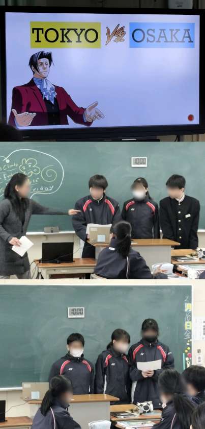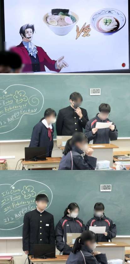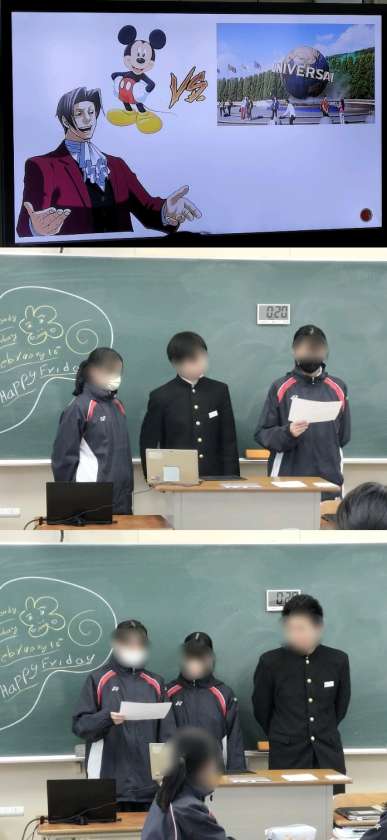 「東京」vs「大阪」、「東京ディズニーランド」vs「USJ」、「ラーメン」vs「うどん」というテーマを与えられて、6つの班に分かれて、それぞれの良いところを英語でスピーチし、どちらが説得力があったか投票で決めました。